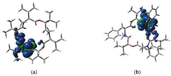 M06-2X/cc-pVDZ calculated spin density distribution over the anion of (a) enniatin B and (b) beauvericin in C1 symmetry (O—red, N—blue, C—grey, H—white, positive, and negative spin density at the 0.0005 a.u. iso-surface is indicated as dark blue and green, respectively).