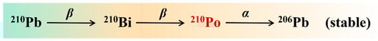 In nature, 210Po is an alpha radionuclide derived from the natural radionuclide 238U through a series of decays [6,7]. The main decay process occurs when238U undergoes a series of decays to 210Pb, 210Pb undergoes beta decay to 210Bi, 210Bi undergoes beta decay to 210Po, and finally 210Po undergoes alpha decay to produce the stable 206Pb (Figure 1) [6]. Polonium-210 has an alpha particle energy of 5.38 MeV and a half-life of 138.4 d [8], which is the longest half-life of all naturally occurring polonium radionuclides. It has high specific activity (1.66 × 1014 Bq/g) [9] and high volatility [10] and can easily form colloids and adsorb on metal surfaces.