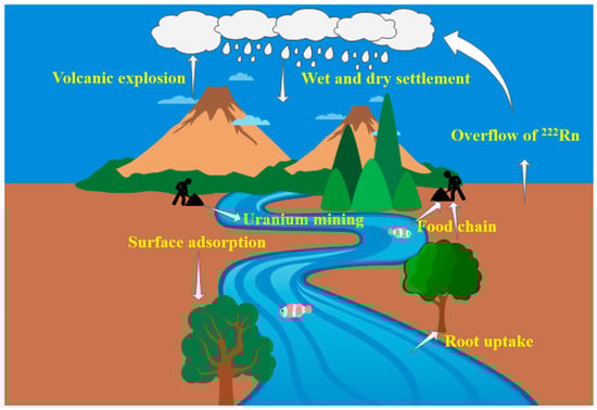 The sources of 210Po in the environment are divided into two main categories: natural and artificial sources. During anthropogenic activities such as uranium mining and hydrometallurgical processing, important decay substrates of the natural uranium system, such as 210Pb and 210Po are discharged with wastewater into the surface water and soil around mines, causing pollution of the hydrosphere and soil lithosphere [2]. Airborne 210Po comes mainly from natural factors such as the decay of 222Rn on the surface of the earth’s crust [12,13], resuspension and wind erosion of soils [14], and volcanic eruptions [15]. Human activities such as fossil fuel combustion, phosphoric acid production, and fertilizer use also increase atmospheric 210Po levels [16]. Atmospheric 210Po and 210Pb are rapidly adsorbed onto aerosol particles [17] and can migrate through aerosols over long distances and for long periods of time, eventually entering the water or settling to the soil surface as dry or wet depositions. Soil and atmospheric 210Po can also enter plant tissues by root uptake or surface adsorption. Eventually, the radionuclide 210Po can become enriched in the human body via our natural food chain (Figure 2).