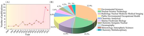 (A) Number of publications on 210Po from 2000 to 2022. (B) Visualization of data for the main application areas of 210Po. Data extracted from Web of Science (April 2023).