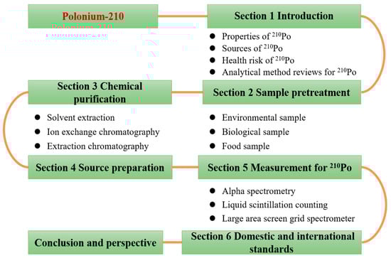 In the 21st century, a large number of scholars have conducted research on 210Po, especially after 2011; the number of research results on the keyword “210Po” on the Web of Science has doubled compared with previous years. The reason for this surge in research may be related to the Fukushima nuclear accident in 2011 (Figure 3). At present, however, there is no coherent review of the 210Po detection literature. To the best of our knowledge, only Matthews [6] and Thakur et al. [28] have reviewed the determination methods of 210Po in environmental samples. But there is still a lack of review of 210Po determination methods in food samples, air samples, and biological samples, as well as a better outlook and prospective prediction of future analytical methods for 210Po. A review of the 210Po method needs to cover a wide range of different sample types.