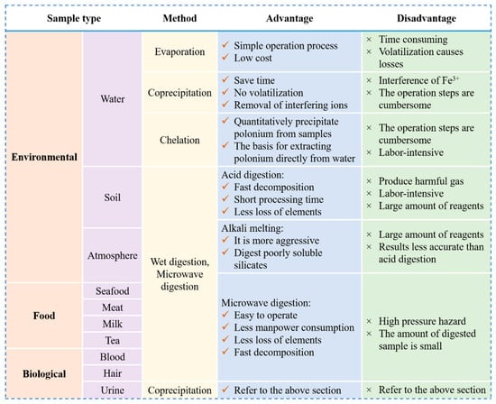 Currently, there are three methods of dissolution for biological samples: dry digestion, wet digestion, and microwave dissolution [84]. For sample dissolution, the wet digestion method has significant advantages over the traditional dry digestion method. First, the wet ashing method can effectively dissolve impurities in the sample and can operate at a lower temperature, thus increasing the efficiency of the process. In addition, the wet digestion method avoids the losses associated with the volatilization of polonium due to heating in the traditional dry ashing method, thus ensuring the accuracy of the sample. However, the efficiency of wet digestion is much lower than that of microwave digestion for samples that contain high amounts of oils [18].