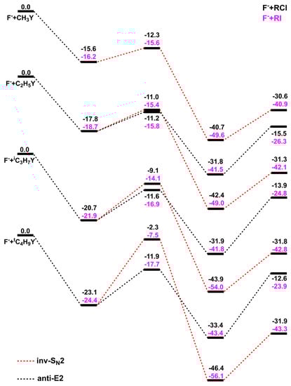 Schematic potential energy surface (PES) of the F− + RY (R = CH3, C2H5, iC3H7, tC4H9; Y = Cl, I) with stationary points along the anti-E2 (black) and inv-SN2 (red) channels at MP2/aug-cc-pVDZ(ECP/d) level. The reported energies (in kcal/mol) are relative to reactants without ZPE.