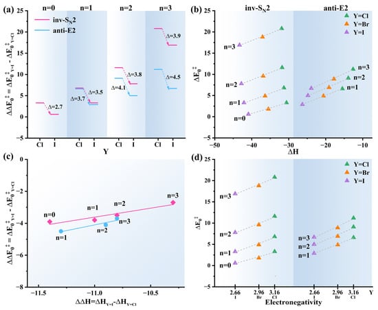 Along the leaving group ability changing from Cl, Br to I, a good linear relationship is found between ∆E0‡ and ∆H for both inv-SN2 and anti-E2 pathways of each F− + RY reaction as presented in Figure 4b. Obviously, the F− + RY reaction set obeys the expression ∆E0‡ = a∆H + C, which connects the barrier with the reaction enthalpy, following the Bell–Evans–Polanyi principle, which is a long-standing chemical theory [58]. Furthermore, good relevance is also found between activation barrier difference ∆∆E0‡ and enthalpy difference ∆∆H for Y = Cl and I with the increased degree of substitution of the corresponding SN2 and E2 pathways as shown in Figure 4c. The above results indicate that, as the leaving group changes from Cl to I, the reaction becomes more exothermic and the barrier drops. Barriers of both inv-SN2 and anti-E2 reactions are found to exhibit good linear dependences with halogen electronegativity increasing in the order of I (2.66) < Br (2.96) < Cl (3.16) as shown in Figure 4d. The above results suggest the decreased electronegativity of Y is expected to lead to a looser TS structure (elongation of C-Y bond), and further a higher reaction reactivity.
