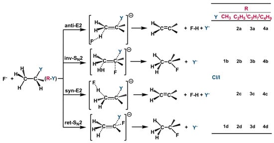 Pathways for reactants F− + RY (R= CH3, C2H5, iC3H7, tC4H9,represented in red; Y = Cl, I, represented in blue).