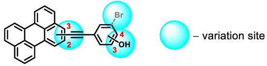 During our investigation of perylene nucleosides, we synthesized the precursor compound, phenol 3a [55]. Given its structural resemblance to other perylene antivirals (Figure 1), we decided to evaluate its antiviral activity, which yielded promising results. Considering the straightforward synthesis process, we proceeded to prepare a small series of similar compounds with modifications in the hydroxyl position, the perylene substitution position, and the inclusion of a heavy atom (bromine) into the molecule (Figure 2).