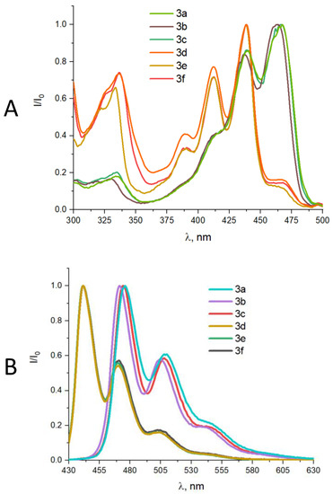 Normalized UV-Vis (A) and fluorescence (B) spectra of compounds 3a–f in 96% EtOH.