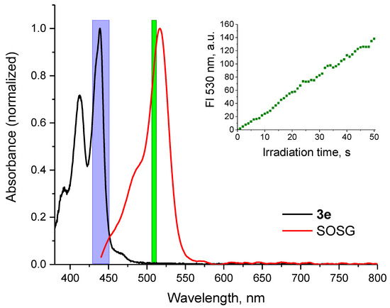 Normalized absorbance spectra of perylene 3e and SOSG in methanol solution. Region of LED irradiation for singlet oxygen generation by perylene compounds is shown in blue, wavelength of SOSG excitation is shown in green. Inset: time course of SOSG fluorescence intensity in a reaction with 1O2 generated by perylene compound 3e under blue light irradiation.