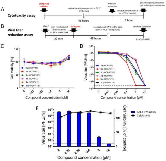 Cytotoxicity and anti-coronaviral activity of perylenylethynylphenols in vitro. (A) Schematic representation of the cytotoxicity assay using Cell Counting Kit-8 (Dojindo Molecular Technologies, Munich, Germany). (B) Schematic representation of the viral titer reduction assay. (C) Cytotoxicity of perylenylethynylphenols at the indicated concentrations for Vero cells. (D) Anti-SARS-CoV-2 activity of perylenylethynylphenols at the indicated concentrations in Vero cells. (E) Anti-FIPV activity of compound 3a in CRFK cells. Data are expressed as the mean ± SD of two independent experiments, each performed in triplicate. The horizontal dashed line indicates the minimum detectable threshold of 1.44 log10 PFU/mL.