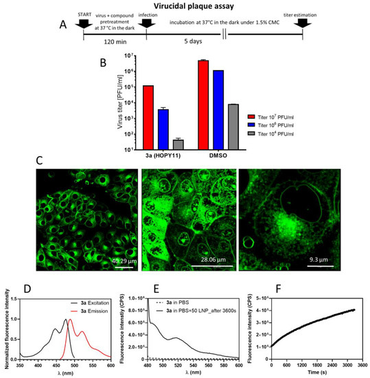 To determine the virucidal activity of compound 3a (10 µM), SARS-CoV-2 in DMEM (titers of 107, 106, and 104 PFU/mL) was mixed with the compound and incubated in the dark at 37 °C for 120 min. Subsequently, the viability of the compound-treated virus was estimated using a plaque assay, as previously described [67]. Viral titers were expressed as PFU/mL (Figure 6A).