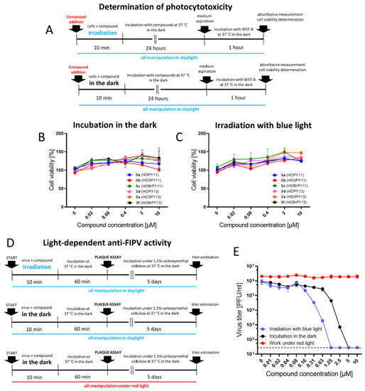 To determine the light-induced cytotoxicity of the compounds, CRFK cells were cultured in 96-well plates for 24 h to form a confluent monolayer and then treated with the tested compounds at concentrations ranging from 0 to 10 µM in daylight. Subsequently, cells treated with the compounds were irradiated with LEDs (465–480 nm, 30 mW/cm2) for 10 min at RT (Figure 7A, top panel). As a negative control, CRFK cells were treated with the compounds in daylight and then incubated in the dark at RT for 10 min (Figure 7A, bottom panel). Subsequently, both irradiated and non-irradiated cell monolayers were incubated for 48 h in the dark at 37 °C. After incubation, the potential photocytotoxicity of the compounds was determined using Cell Counting Kit-8 (Dojindo Molecular Technologies, Munich, Germany) according to the manufacturer’s instructions.