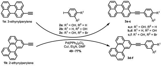 General procedure for the synthesis of (perylen-3-ylethynyl)-(3a–c) and (perylen-2-ylethynyl)-(3d–f) arenes. 3- or 2-Ethynylperylene (1.2 eq.), the corresponding iodophenol (1 eq., see Table 1), bis(triphenylphosphine)dichloropalladium (0.05 eq.), and copper(I) iodide (0.1 eq.) were dissolved in dry DMF (~100 mL). The mixture was evacuated and purged with argon 5 times, then triethylamine (5 eq.) was added. The reaction mixture was heated up to 80 °C and stirred overnight. Then, the mixture was diluted with ethyl acetate (150 mL), washed with 1% aq. EDTA (200 mL), water (3 × 200 mL), and brine (200 mL), dried over anhydrous sodium sulphate, filtered off, and evaporated in vacuo to give a raw solid. The residue was purified by column chromatography in the appropriate solvent system on silica gel. The corresponding fractions were pooled and evaporated to yield desired compounds as colored solids.