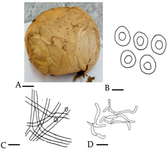 (A) Basidiocarp = 9 cm; (B) spores = 0.2 µm; (C) eucapillitial threads = 0.9 µm; (D) peridial threads = 0.7 µm.