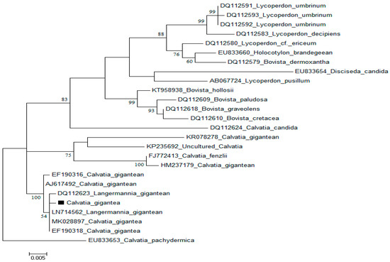 For the phylogenetic analysis of C. gigantean, identical sequences of C. pachydermica (EU833653) were downloaded from Gene Bank [16]. The EMBL-EBI online MUSCLE program (http://www.ebi.ac.uk/) (accessed on 1 October 2021) was used to align downloaded gene sequences. The ITS data set includes approximately 1850 characters; the aligned sequences from the 5′ and 3′ ends of the ITS data set were removed, leaving just 500 characters in the final analysis. In total, 88 singletons, 190 prism-informative sites, 285 variable sites, and 277 conserved characters were included in the final alignment. The MEGA 6 tool with default settings was used to create the phylogenetic tree and reference sequences from GenBank.