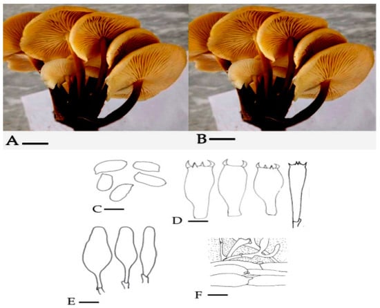 (A) = (pileus 1.5 μm); (B) = (lamellae & stipe) (1.5 μm); (C) = Ballistoconidia (10 μm); (D) = Basidium (5 μm); (E) = Cheilocystidium (12 μm); (F) = cuticle (8 μm).