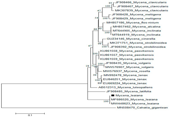 The identical sequences from GeneBank were used to construct the phylogenetic tree of M. leaiana (MN508470) [18]. All obtained sequences were aligned using the EMBL-EBI MUSCLE program (http://www.ebi.ac.uk/) (accessed on 1 October 2021). Once fully aligned sequences, 1800 nucleotides were removed from the 5′ and 3′ ends, only 540 sequences were utilized in the final section. The final alignment included variable sites (285), prism-informative sites (190), singletons (88), and 277 conserved characters. The phylogenetic tree was generated by using MEGA 6 tool with default setting.