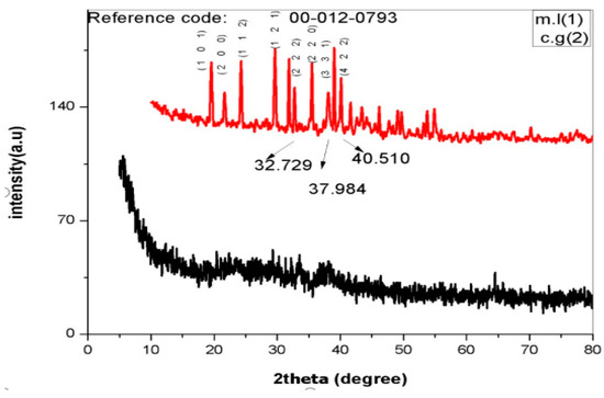 XRD patterns of C. gigantea as well as M. leaiana showed a 2θ peak from 0 to 75 throughout the spectra. XRD pattern spectra clearly indicated the amorphous shape of M. leaiana and crystalline C. gigantea AgNPs structures. The particle size histogram of the silver nanoparticles obtained shows a broad distribution of particle size. The particle size ranged from 30 to 70 nm, and the average particle size comes out to be 65 nm. The XRD broadening peak was due to the moderate rate of reduction, indicating sizable NPs (Figure 5) [19,20]. C. gigantea XRD patterns showed seven peaks at 32.72°, 37.98° and 40.51°, corresponding to (220), (331) and (422) crystal planes [21]. XRD patterns were attributed to bio-organic crystallization due to some unknown peaks at 19.46°, 21.48°, 24.35° and 29.557° on AgNPs surface. The peaks were compared with an X-ray diffraction database. The same XRD patterns of Azadirachta indica NPs displayed characteristic peaks at 32.6°, 46.6°, 55.2°, 57.8°, 67.8°, 74.8°, 77.2° and 85.9°, which is in correspondence with (200), (220), (311), (222), (400), (331), (311) and (422) khl planes.