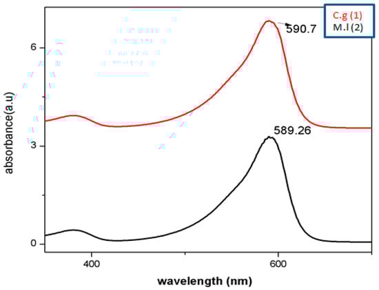 Physiochemical and biological approaches have been employed to synthesize AgNPs in 1 h utilizing aqueous composites of C. gigantea and M. leaiana. However, when mushroom composites were incubated with distilled water (control), they remain their original color, whereas AgNO3-treated composites become brownish after 1 h due to SPR in the NPs. The solution of AgNO3 used alone as negative control showed no color change over 2 months. Our results coincide with a previous report [22]. The SPR peak of metallic NPs is highly dependent on their structure, as well as the chemical environment, which changes the position of the peak. The spectra exhibited SPR bands between 500 and 600 nm for both samples. The 600 nm peak is attributed to a tyrosine protein that stabilizes NPs or amide bands and tryptophan. The collective oscillation of the conducting electrons on the surface of the nano-sized particle absorbs visible electromagnetic waves, which confirms that silver particles are nano-sized [23] (Figure 6).
