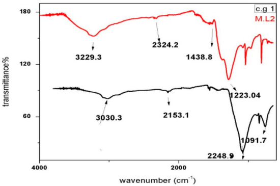 Functional groups present in the nanoparticles of C. gigantea along with M. leaiana were identified using FT-IR spectroscopy, reducing Ag ions and the capping reagent that maintains bio-reduced AgNPs. The absorption bands of C. gigantea were centered at 1091, 2153, 2248 and 3030 cm−1 and those of M. leaiana at 1223, 1438, 2324 and 3229 cm−1. The appearance of crests that were prominent were located at 3030 and 3229 cm−1, suggesting hydroxyl stretching (O-H), which is linked with the movement of alcohol as well as phenolic groups from mushroom AEs to AgNPs. Another group of crests was observed at 2248.9 and 2324.2 cm−1, associated with nitro stretching (-NO2 group). The peak of C. gigantea at 1091 cm−1 was associated with carboxyl stretching (C-O) vibration, attributed to Ester linkages, while the peak at M. leaiana 1223 cm−1 was associated with acetyl stretching (CH3-CO groups). Therefore, from the FTIR results, it is clear that the synthesized nanoparticles were surrounded by proteins and amino acids, which may be responsible for the stability of the silver nanoparticles. Proteins and capping agents are essential for stabilizing the synthesized AgNPs, and O-H, C-O, N-O as well as acetyl groups can transform Ag ions to metallic Ag (Figure 8) [26].