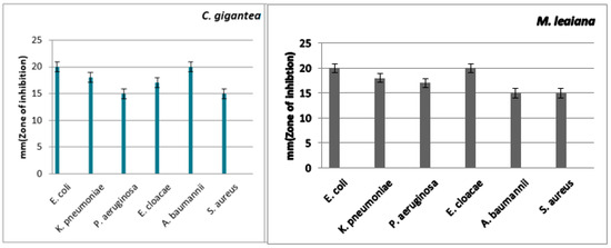 C. gigantea methanolic extract has strong anti-MDR pathogen activity. The ZOI against K. pneumoniae was 23 mm, and the minimum was 11 mm against E. cloacae. The largest ZOI of M. leaiana methanolic extract was 20 mm against E. coli and E. cloacae and displayed the minimum size against A. baumannii and S. aureus, which was 15 mm (see Table 1 and Table 2) (Figure 9). Previous research revealed that the methanolic composite of G. lucidum showed similar efficacy against K. pneumoniae (21 mm) and E. coli (20 mm) [28]. Methanolic extracts were shown to have the most common antibacterial actions against Gram-negative bacteria as compared to Gram-positive pathogens. Gram-negative bacteria contain an outer membrane that is hydrophilic because of the occurrence of lipopolysaccharide molecules that enable smaller lipophilic compounds to move via the membrane, which is necessary for any antibacterial solute to penetrate the microorganisms’ membrane. Methanol has low water solubility and can easily penetrate into the outermost membrane of Gram-negative pathogens, disrupting their metabolism and cellular function, leading to the death of the microbes [29].