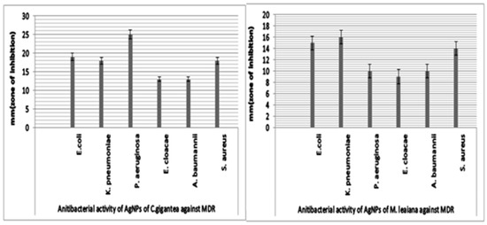 Antibacterial potential of silver NPs of C. gigantea (C) and M. leaiana (M) against MDR bacteria.