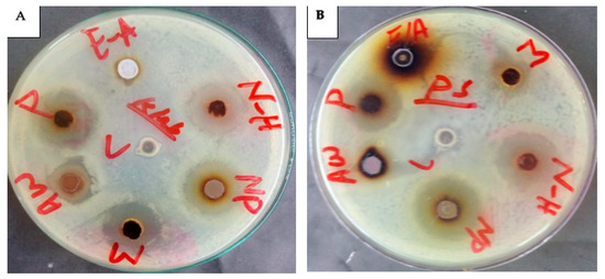The pure water extract of mushroom samples showed good antibacterial activity against microbes. The maximum ZOIs were 20 mm against S. aureus and K. pneumoniae and the minimum was 17 mm against E. cloacae. M. leaiana’s peak ZOI was detected to be 22 mm against S. aureus and the lowest was 16 mm against K. pneumonia (see Table 1 and Table 2). Aqueous extracts from both species of mushrooms represented high activity against most of the sensitive and resistant clinical isolates. Aqueous extracts’ bacterial inhibition halos against Gram-positive bacteria varied between 8 and 25 mm for B. edulis and 8 and 18 mm for N. luridiformis. Aqueous extracts also demonstrated high bacterial inhibition halos against P. aeruginosa, with values ranging from 13 to 21 mm and 7 to 17 mm for B. edulis and N. luridiformis, respectively [33].