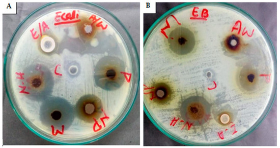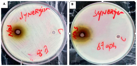 The synergetic effect of AgNPs against (A) = E. cloacae (E.B = 21 mm) and (B) = S. aureus (staph. = 29 mm).