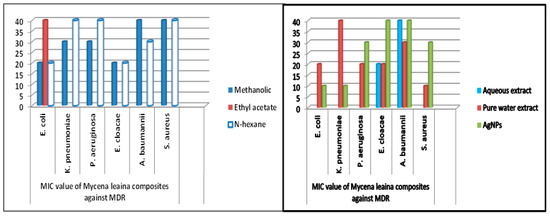 The n-hexane-derived mushroom extract exhibits strong antibacterial potential against examined MDR bacteria. The highest ZOI was examined against P. aeruginosa (22 mm), while the smallest was 16 mm against S. aureus. The largest ZOI of M. leaiana n-hexane extract was measured against E. coli (19 mm), while the smallest was against K. pneumoniae and was 10 mm (see Table 1 and Table 2). C. gigantea and M. leaiana n-hexane extracts were more effective against all tested pathogens than ethyl-acetate extracts. At 100 μL, the n-hexane extract of V. sativa showed the maximum antibacterial activity at 100 mg/mL concentration against E. coli (40 mm) [31].
