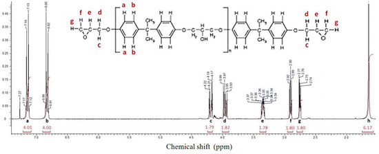 The equivalent epoxy weight (EEW) of a DGEBA resin represents very important data for developing formulations with a stoichiometric epoxy/hardener ratio. For the present work, the DGEBA supplier’s data only indicated a batch with < 700 g·mol−1. Consequently, the exact EEW and values were determined based on the experimental determination of the DGEBA average polymerization degree, , via 1H NMR data [47,48], knowing that:
