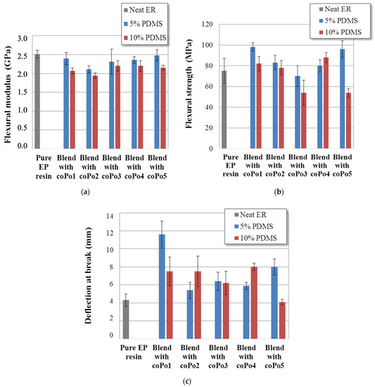 Flexural characteristics of pure epoxy resin and epoxy/silicone blends with different compatibilizers: (a) flexural modulus, (b) flexural strength, and (c) deflection at break.