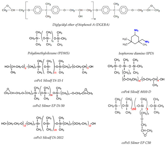 The high-purity diglycidyl ether of bisphenol-A (DGEBA, RENLAM CY219) was purchased from Huntsman Advanced Materials, Europe, Basel, Switzerland. The curing agent, isophorone diamine (IPD), was purchased from Sigma-Aldrich, Saint-Quentin-Falavier, France. Trimethylsiloxy-terminated polydimethylsiloxane (PDMS, Mw = 28,000 g·mol−1) was purchased from Alfa Aesar, Illkirch, France. The different linear di-functional or multi-pendant silicone polyethers used as compatibilizers (Figure 10 and Table 6) were kindly provided by Siltech Co., Toronto, ON, Canada. All components are liquids and were used as received.