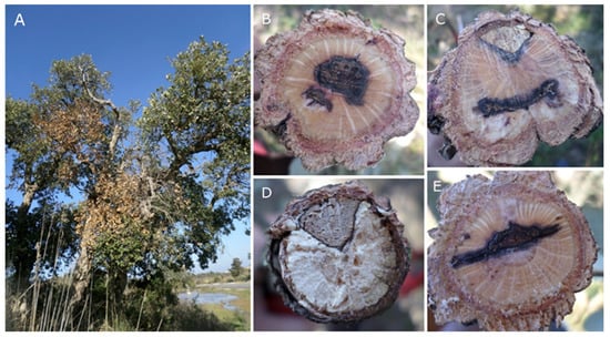 Cork oak tree showing extensive twig and branch dieback (A); internal lesions of sectioned branches (B–E).