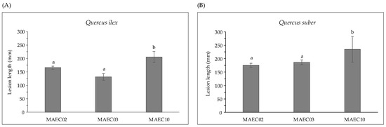 Lesion lengths (mm) caused by MAEC02, MAEC03 and MAEC10 strains of Diplodia corticola inoculated on detached green shoots of (A) Quercus ilex and (B) Quercus suber. Tests were performed in five replicates and results are presented as the mean ± standard deviation (SD). Data with different letters (a,b) in each panel are significantly different (one-way ANOVA followed by Tukey’s post hoc test; p < 0.05). Values with dissimilar letters are significantly different from each other (p < 0.05). Values with the same letter are not significantly different (p > 0.05).