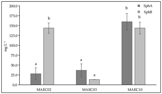 Concentrations (expressed as mg L−1) of Sph A and Sph B in culture filtrates of Diplodia corticola MAEC02, MAEC03 and MAEC10. Analyses were performed in triplicate and results are presented as the mean ± standard deviation. Data with different letters (a,b) are significantly different (two-way ANOVA followed by Tukey’s post hoc test; p < 0.05). Values with dissimilar letters are significantly different from each other (p < 0.05). Values with the same letter are not significantly different (p > 0.05).