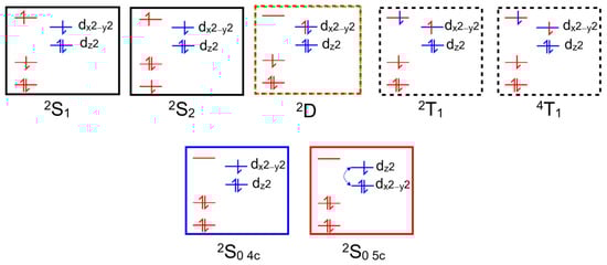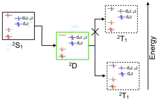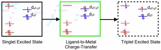 Copper porphyrins can exhibit characteristics of both porphyrin-centered and metal-centered excited states, and the coupling of porphyrin-based excited states to the unpaired electron on the copper can, in specific circumstances, open an efficient spin-allowed route to the triplet hypersurface. This process is known as enhanced intersystem crossing (EISC) [], and it is represented schematically in Figure 2. Orbitals and electrons centered on the porphyrin are colored red, while those on the copper atom are colored blue. Of particular interest here is the role of the ligand-to-metal charge-transfer (LMCT) state (green box) in facilitating a spin-allowed route to the triplet hypersurface (dashed box).