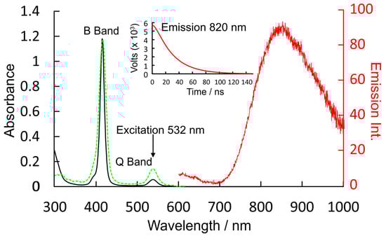 The UV/vis. absorption spectrum (black) showing the B and Q bands of CuPh in toluene, the emission (red) following 532 nm excitation and the time profile data for this emission as the inset; the dashed green spectrum is the excitation spectrum for the emission at 820 nm.