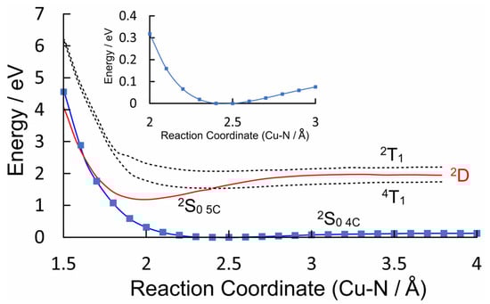 The valence orbital energies and fragment compositions for CuPh are presented in Table S3 and a summary of the electronic transitions is available in Table S4 in the Supplementary Materials. A relaxed potential energy plot was constructed via DFT methods, in which the location of a nitrogen atom of pyridine was held at fixed distances from the copper atom in CuPh. All the other structural parameters were allowed to optimize in these calculations. The resulting plot of energy against the Cu–N(pyridine) distances is presented in Figure 5 as the blue plot, with the data points indicated by blue squares. This profile exhibits a small minimum at a Cu–N(pyridine) distance of 2.5 Å, which indicates very weak interaction between the copper porphyrin and pyridine. This weak interaction (see the inset in Figure 5) results in a redshift of the B-band maximum [], and it will affect the time-averaged structure of the CuPh–pyridine complex in the solution. It is estimated that between 35 and 55% of CuPh exists as the five-coordinate complex in neat pyridine at room temperature [].