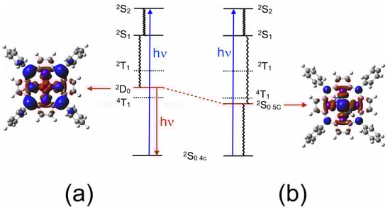 Copper II complexes have an unpaired d-electron (3d94s0), which in the four-coordinate ground state is presumed to be in the dx2−y2 orbital. This d-configuration facilitates the location of the copper atom in the plane of the porphyrin ring, while the fully occupied dz2 orbital inhibits axial coordination of further ligands. Optical excitation can populate either the S1 or S2 porphyrin-centered excited states. The overall multiplicity of the copper porphyrin is that of a doublet, and Gouterman developed specific terminology to describe this electronic configuration or metalloporphyrins such as these []. A superscript numeral represents the overall multiplicity of the metal porphyrin complex, 2 for a doublet, as is the case for the copper porphyrins, while the multiplicity of the porphyrin is indicated by an uppercase letter (S for singlet, D for doublet or T for triplet). The ordering of the states in terms of energy is represented by numeric subscripts. We have added a slight refinement by adding a subscript 4c or 5c to represent four-coordinate or five-coordinate complexes, respectively. Schematic representations of these states are presented in Figure 3, which can act as a reference for the terminology used throughout this paper.