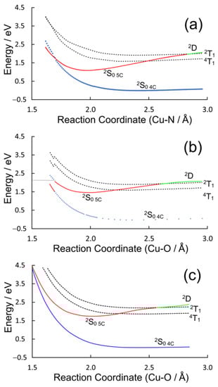 The potential energy plots obtained by varying the Cu–donor atom distance between 1.5 and 3 Å for (a) pyridine, (b) water, and (c) thymine; the blue plots describe the behavior of the four-coordinate 2S0 ground state, the dashed curves represent the triplet 2T1 and 4T1 states and the green curve is the 2D state, which develops into the five-coordinate (5c) ground state (2S0 5c red curve) at shorter Cu–donor atom distances.