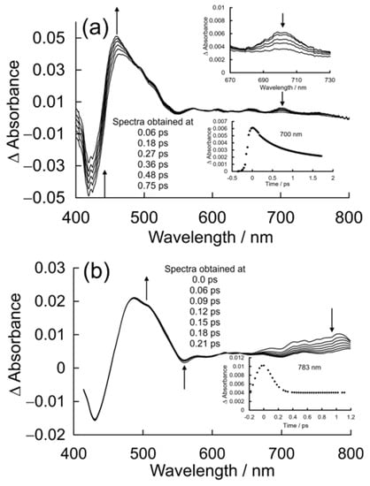 - Inamo, M.; Okabe, C.; Nakabayashi, T.; Nishi, N.; Hoshino, M. Femtosecond time-resolved photo-absorption studies on the excitation dynamics of chromium(III) porphyrin complexes in solution. Chem. Phys. Lett. 2007, 445, 167–172. [Google Scholar] [CrossRef]