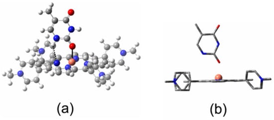 The rate of expulsion of the axial ligand from the five-coordinate species depends on the nature of the axial ligand. For example, the rate is relatively slow when thymine is the axial ligand. This is because, for thymine, additional hydrogen bonding interactions between the endocyclic hydrogen atoms and the nitrogen atoms of the porphyrin stabilize this species (Figure 11a). The copper atom is displaced from the center of the porphyrin ring because of alterations to the d-electron configuration (Figure 11b). The porphyrin ring vibrations are insensitive to the nature of the axial ligand, and it is the changes to these vibrations that are monitored in Raman studies in the 1300 to 1700 Δcm−1 region. This explains why simple Raman spectroscopy cannot distinguish between different five-coordinate complexes and time-resolved Raman techniques are required.