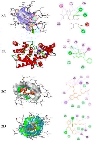 The molecular docking analysis showing the ligand beta-d-glucopyranoside, methyl-1 (2A), ligand 9-benzyl-2,6-dichloro-9H-purine (2B), Bis(2-ethylhexyl) phthalate first ranked (2C), and Bis(2-ethylhexyl) phthalate second-ranked pose (2D) bonded with the active domain of PDE5. The 3D depicts the docking of ligand to PDE-5. Dashed lines in 2D* depiction show the interaction between the ligand with the different active pockets of the enzyme.