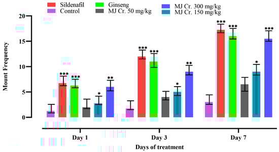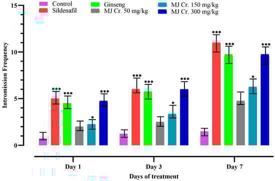 Following the limit test, a comprehensive assessment of the aphrodisiac potential was conducted on male rats. Sexual parameters including mount frequency (MF), intromission frequency (IF), and ejaculation frequency (EF) were measured, which are indicative of libido, potency, and vigor. An increase in MF signifies enhanced sexual motivation, while an increase in IF suggests improved penile efficiency, erection, and orientation of penile muscle. Furthermore, an increase in EF indicates the aphrodisiac properties of the treatments. These sexual parameters served as important indicators in evaluating the aphrodisiac effects of the tested treatments on the male rats [20,25,26]. In the current study, the analysis of video recordings showed that rats administered with sildenafil, ginseng, and different doses of M. jalapa crude extract (MJ Cr.) exhibited increased MF, IF, and EF. On the other hand, the animals form the control group (received only distilled water) displayed lower MF, IF, and EF. Notably, the rats treated with the 300 mg/kg dose of MJ Cr. extract showed significant increases (p < 0.05) in all the mentioned parameters on the first, third, and seventh days of the treatment. Statistical analysis employing two-way ANOVA, further followed by Tukey’s test, verified that the period of treatment with MJ Cr. extract at a dosage of 300 mg/kg had a notable influence (p < 0.05) on the incidences of mounting, intromission, and ejaculation (Figure 3, Figure 4 and Figure 5).