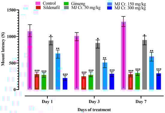 Effect of extract of M. jalapa roots on mount latency in male albino rats. *** indicate (p < 0.01), ** (p < 0.03), and * (p < 0.05).