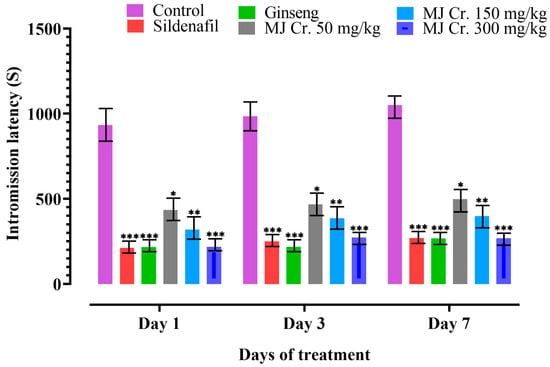 Effect of extract of M. jalapa roots on intromission latency in male albino rats. *** indicate (p < 0.01), ** (p < 0.03), and * (p < 0.05).