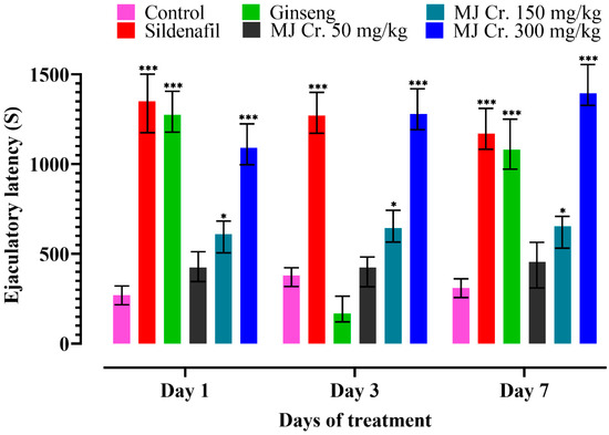 An increase in EL indicates higher sexual motivation and direct sexual intercourse between male and female rats, bypassing mounting and intromission and leading to ejaculation. It demonstrates a significant improvement in the copulatory performance of both male as well as female rats [19,28]. Results of the present study also indicated that EL was the most prominently found in the rats treated with sildenafil, followed by those administered with MJ Cr. 300 mg/kg, and then those given ginseng. There was a significant (p < 0.05) difference in the ejaculatory latencies of the rats given MJ Cr. 300 mg/kg and MJ Cr. 150 mg/kg when compared to those in the control group. The least ejaculatory latencies were shown by the rats in the control group, followed by MJ Cr 50 mg/kg and MJ Cr 150 mg/kg, respectively. An analysis involving a two-way ANOVA, followed by Tukey’s test, suggested that the treatment durations did not significantly impact (p > 0.05) the ejaculatory latencies. This could likely be due to differing responses among the rats (Figure 8).