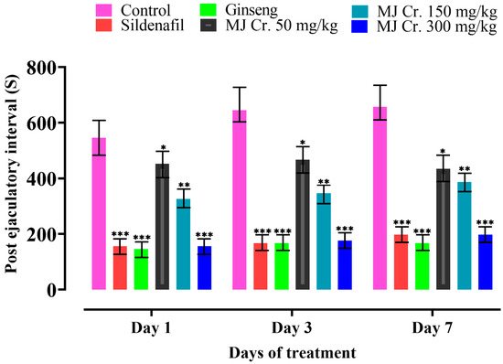 The decrease in post-ejaculatory interval (PEI) observed in male rats indicates an increase in libido, potency, and a faster recovery rate from exhaustion during sexual intercourse. A shorter PEI suggests enhanced sexual vigor and a higher likelihood of engaging in subsequent sexual activity [29]. A notable reduction in PEI was observed in rats treated with MJ Cr. 300 mg/kg extract and followed by those administered with sildenafil and then ginseng, respectively. This indicates that these treatments resulted in shorter recovery times between ejaculations, reflecting better penile erections and improved copulation. The PEI of rats treated with MJ Cr. at various doses (300 mg/kg, 150 mg/kg, and 50 mg/kg) showed a significant difference (p < 0.05) compared to the rats in the control group. However, the statistical analysis, involving two-way ANOVA followed by Tukey’s test, revealed that the duration of treatment did not significantly affect PEI (Figure 9).
