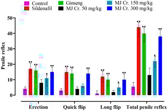 Significant variations (p < 0.05) in erection and quick flip reflexes were observed in rats treated with sildenafil, ginseng, MJ Cr. 300 mg/kg, and MJ Cr. 150 mg/kg extracts when compared to the control group. Notably, the outcomes for erection and quick flip reflexes with the MJ Cr. 300 mg/kg extract were significantly similar to the results produced by the standard drug, sildenafil. These findings suggest that the MJ Cr. 300 mg/kg extract exhibited similar effects to sildenafil in promoting erection and quick flip reflexes, indicating its potential as an aphrodisiac agent. On the other hand, long flip reflexes exhibited by the rats administered with sildenafil, ginseng, MJ Cr. 300 mg/kg, as well as MJ Cr. 150 mg/kg were found higher and significantly different (p < 0.05) when compared to the control group. The control group and the rats were treated with MJ Cr. 50 mg/kg demonstrated the least improvement in long flips. In conclusion, the total penile reflexes were significantly improved in all the treated groups, except for the rats treated with MJ Cr. 50 mg/kg, which showed similar results to the control group. Among the treated groups, the highest total penile reflexes were observed in rats treated with sildenafil, followed by ginseng, MJ Cr. 300 mg/kg, and MJ Cr. 150 mg/kg. This suggests that these treatments have a positive impact on penile reflexes, indicating improved sexual performance (Figure 10).