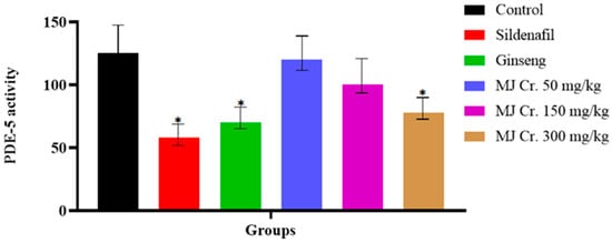The in silico analysis of M. jalapa root extract indicated its remarkable conformations and interactions with the target protein, PDE-5, and its in vivo aphrodisiac activities in normal rats further insighted us to investigate its enzyme inhibitory activity in vitro. In vitro enzyme inhibitory assay findings revealed that sildenafil exerted the most potent inhibitory action against PDE-5, followed by ginseng and then MJ Cr. 300 mg/kg, respectively. These inhibitory effects were notably different (p < 0.05) from that of the control group. Nevertheless, the inhibitory effects presented by MJ Cr. 150 and 50 mg/kg were comparatively mild and did not achieve statistical significance (Figure 11).