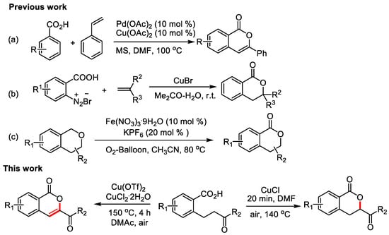 Our previous study [43] displayed that 2-(3-oxobutyl) benzoic acid can be generated from aromatic carboxylic acids and 1-penten-3-one in one pot via rhodium-catalyzed carboxyl-directed conjugate addition of C–H bonds to α,β-unsaturated ketones in air and water. We envision that whether 2-(3-oxobutyl) benzoic acid can undergo intramolecular cyclization reaction and oxidative dehydrogenation to yield dihydroisocoumarins and isocoumarins in one pot. Herein, we illuminated copper-promoted intramolecular oxidative dehydrogenation of 2-(3-oxoalkyl) benzoic acid for synthesizing dihydroisocoumarins and isocoumarins in a step in air.